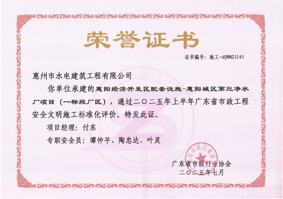 惠州市水電建筑工程有限公司成立于一九六四年四月,隸屬惠州市水務(wù)集團(tuán)有限公司,是一家國有綜合性施工企業(yè),主營水利水電工程、房屋建筑、市政工程等施工業(yè)務(wù)。公司擁有水利水電工程施工總承包一級(jí)、建筑工程施工總承包一級(jí)、市政公用工程施工總承包一級(jí)、公路工程施工總承包三級(jí),公路路基、路面及建筑裝修裝飾專業(yè)承包二級(jí),環(huán)保工程、機(jī)電安裝、河湖整治、輸變電工程專業(yè)承包三級(jí)等經(jīng)營資質(zhì)……